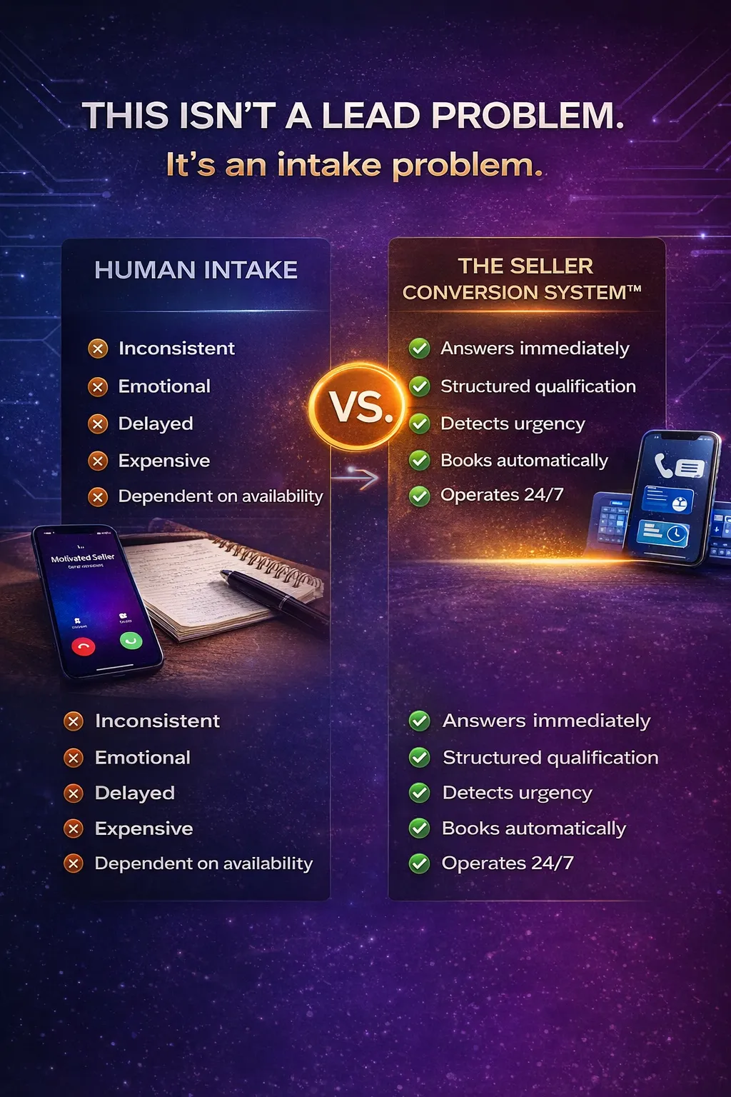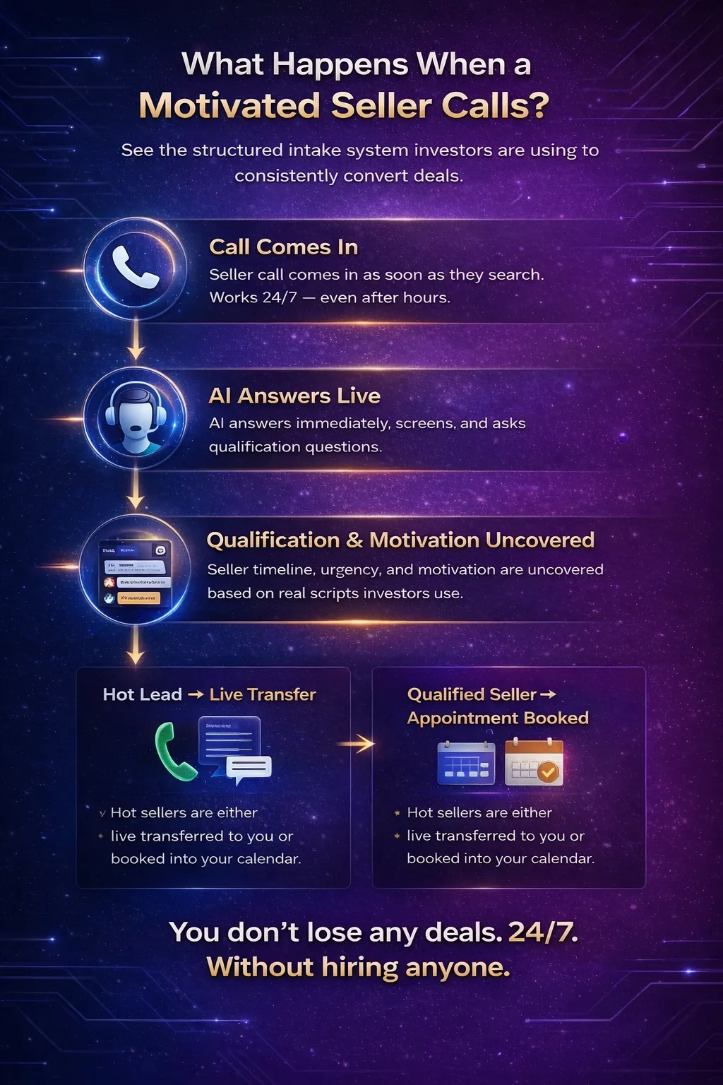 No. It filters, qualifies, and routes leads so your team only speaks with serious sellers.